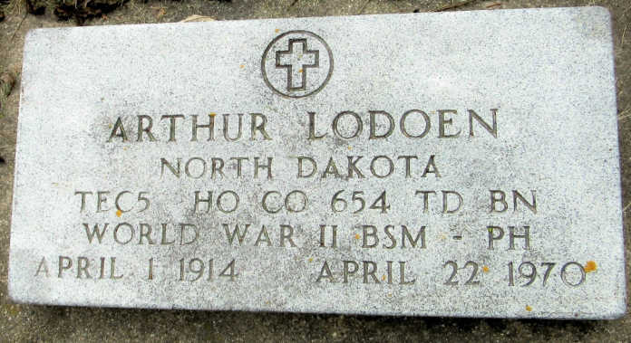 Lodoen is last listed on the 134th's personnel roster on June 7th, 1945, inferring that he retired from the service sometime around then. He moved back to Westhope where he lived the rest of his life on the farm. Arthur passed away tragically when he was struck by a car on April 22, 1970 at the age of 56. At the time of his death, he was surived by his wife; a son Gary of Iowa City, Iowa; three brothers, Oscar and Clarence, both of Westhope, and Milo of Bottineau; and a sister, Mrs Arthur Gunning of Lansford. His parents and a sister preceded him in death. Arthur's funeral service was held in St. Andrew's Catholic Church. He is buried in Westhope, North Dakota at the Westhope Cemetery.